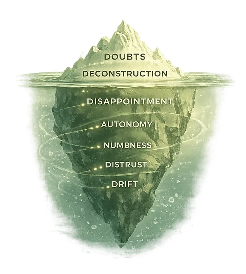Identify the deeper pathway beneath doubt, drift, disillusionment, or deconstruction.